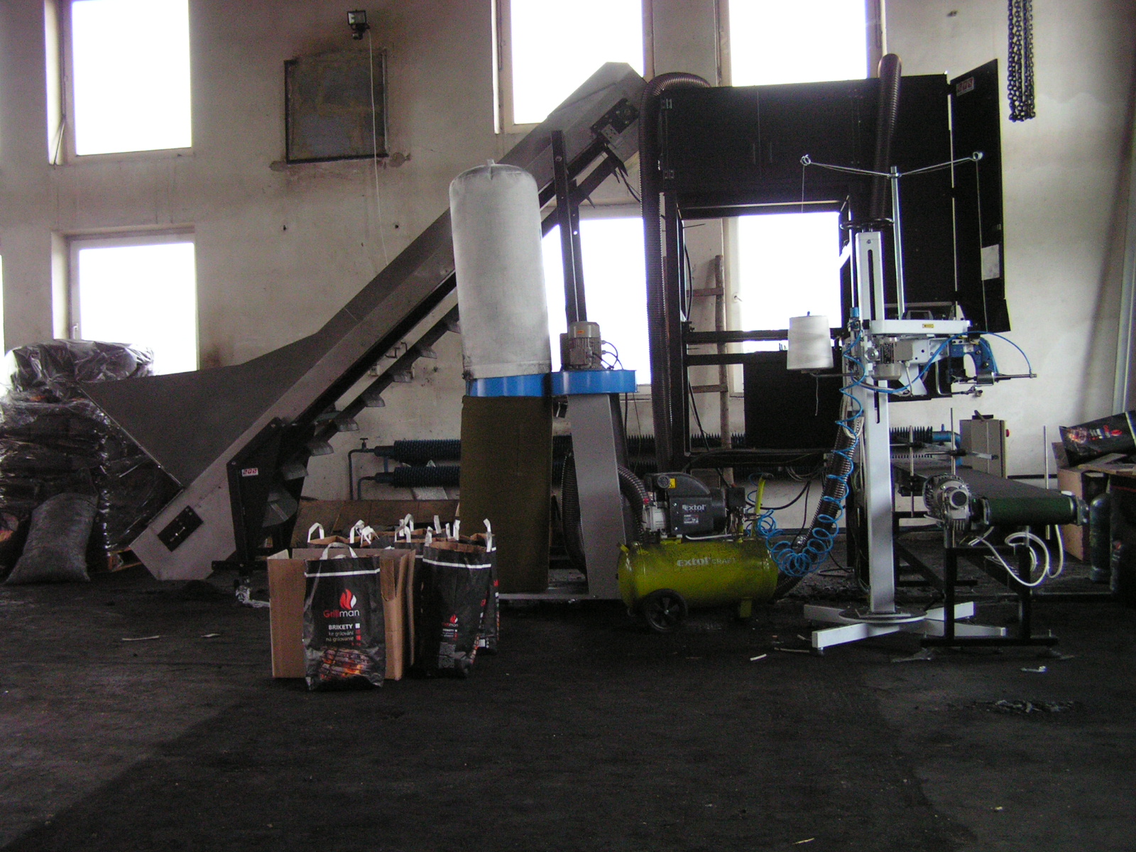 Obsluha nasype do násypky doplňovacího dopravníku dřevěné uhlí. Do upínacího zařízení vloží obsluha prázdný pytel. Stiskem šlapky (nebo tlačítka) se odstartuje automatický cyklus, který se skládá z následujících kroků: